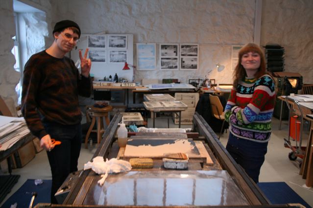 Ja, virksemið er nógv og áhaldandi her í Steinprenti. Hølini niðri undir eru brúkt í sambandi við bókaútgávur, konsertir og framløgur og hava tiltøkini sum heild verið væl eydnað og væl vitjað. Pernille Kløvedal Helweg bleiv liðug við stóru verkætlan sína, har eitt avtrykk av einum grindahvali varð etjað í kopar. Dugnaligi koparprentarin Mette Marrott luttók í hesi verkætlan, sum lærdi okkum nógv um koparprent og hava vit avtalað við hana, at hon vitjar aftur. Framsýningin niðri undir við objektum úr træi og kollasjum hjá Hanna Bjartalíð hevur verið sera væl vitjað. Við stuðli frá Norðurlandahúsinum kom Hanni higar og arbeiddi á verkstaðnum við permuni til jubileumsútgávuna av tíðarritinum Vencil, sum kemur á enskum. Framsýningin hjá Hanna verður hangandi til og við 26. mars og næsta framsýning verður við linoleumsskurðum hjá danska, grafiska úrmælinginum Palle Nielsen (1920-2000).
