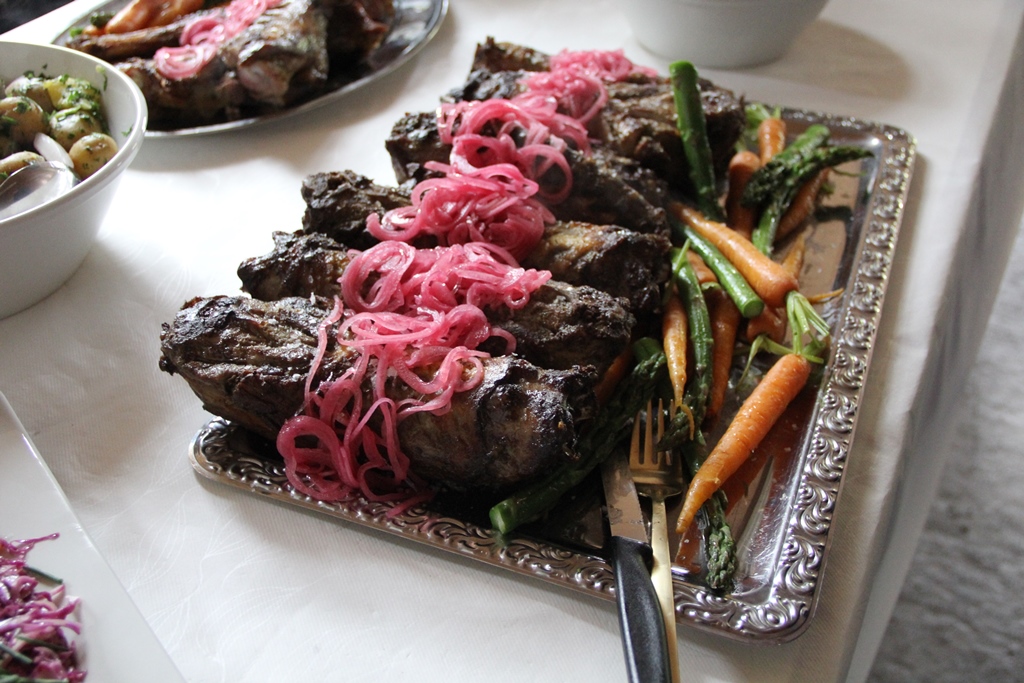 Hesin hugvekjandi tanki, at mana tey fornisku upp úr jørðini, rewoking the trolls, stóð heilt greiður í luftini, tá Gutti og hansara handgingu menn, gróvu niður í grúgvheitu jørðina, at leggja sundurlimaðu lambskrovini niður í døkku moldina, við smakkgevandi tara og urtum omaná, innan seinasta flag varð lagt omaná, so fyrsti liður í shamanistisku matgerðini kundi byrja niðri á bakkanum undir Uppistovugarði hjá Jastrid og Símuni Gullaksen.